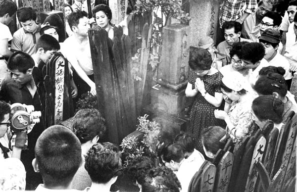 遺体発見現場で冥福を祈る人びと=1965年(C)共同通信社