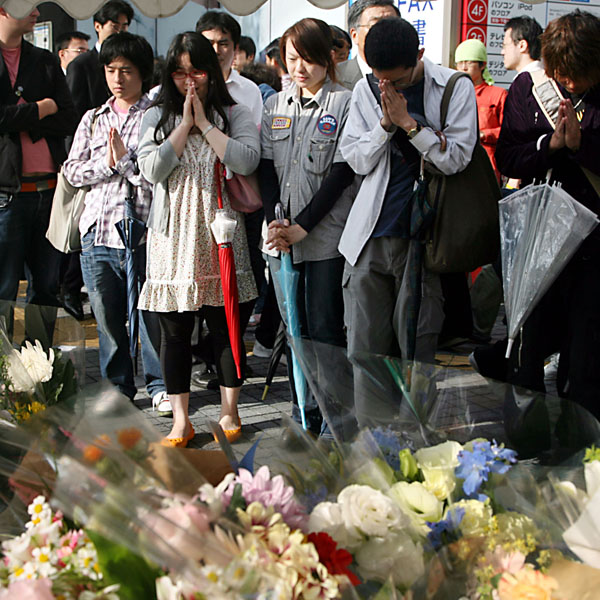 2008年東京・秋葉原無差別殺傷事件(事件が起きた中央通りの交差点付近で花などを手を合わせる人々=当時)/(C)日刊ゲンダイ