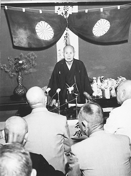 法皇の座からあいさつする“熊沢天皇”(1957=昭和32年6月28日、東京・上野名月館)/(C)共同通信社