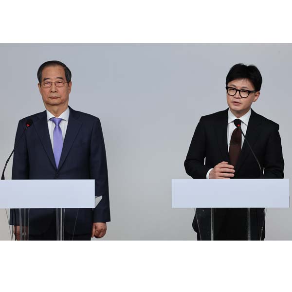 与党国民の力党(PPP)の韓東勲党首(右)と韓悳洙首相が揃って会見(C)Yonhap News Agency/共同通信イメージズ