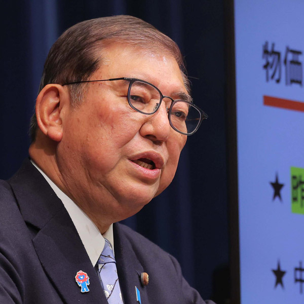 商品券10万円配布、世間は忘れていない(商品券について報道陣の取材に応じる石破首相)/(C)共同通信社