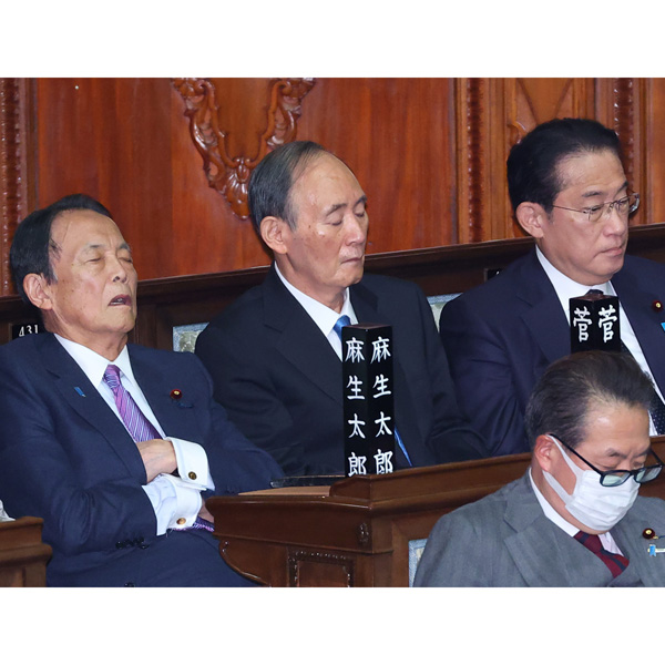 元気なのは一人だけ(左から麻生太郎元首相、菅義偉元首相、岸田文雄前首相)/(C)日刊ゲンダイ