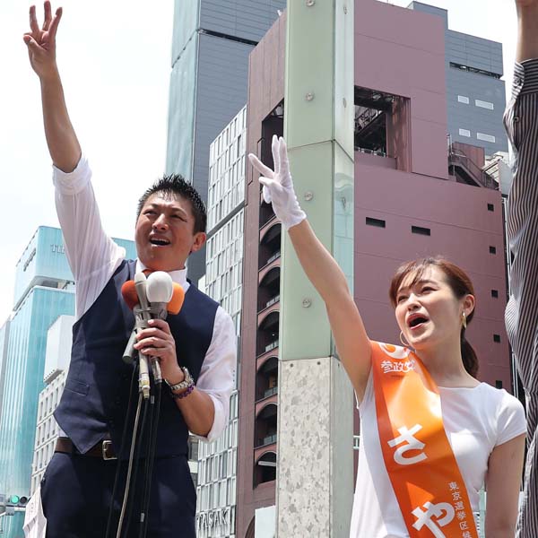 さや候補と参政党ポーズの神谷宗幣代表(C)日刊ゲンダイ