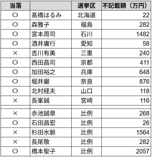 【別表】旧安倍派「裏金候補」15人の当落と不記載額(C)日刊ゲンダイ