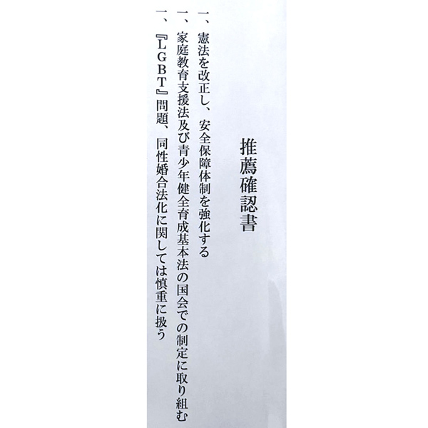 2021年衆院選前、旧統一教会の関連団体が自民党衆院議員と交わした「推薦確認書」/(C)共同通信社