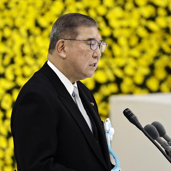 全国戦没者追悼式で式辞を述べる石破首相(C)共同通信社
