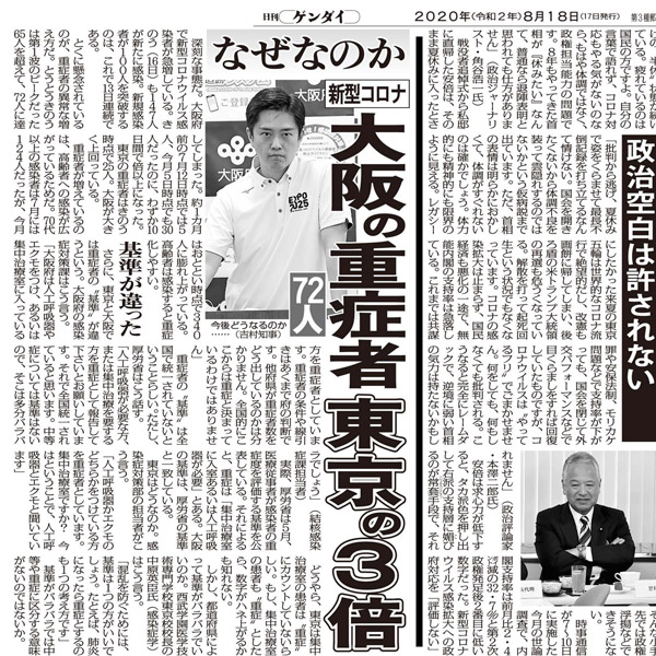 「新型コロナ 大阪の重症者東京の3倍」(2020年8月18日)/(C)日刊ゲンダイ