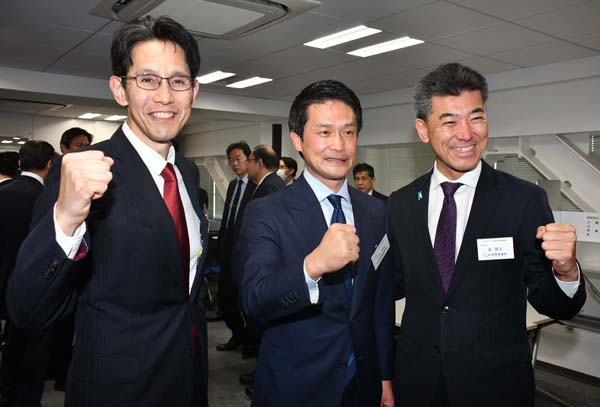 ポーズはいいのだが…(左から階幹事長、小川代表、泉元代表)/(C)日刊ゲンダイ