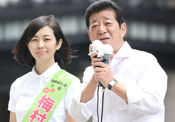 梅村議員の応援演説をする松井維新代表(C)日刊ゲンダイ