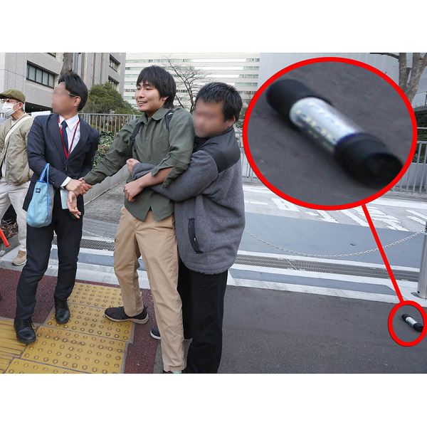取り押さえられる宮西詩音容疑者と犯行に用いられた閃光手榴弾(C)日刊ゲンダイ