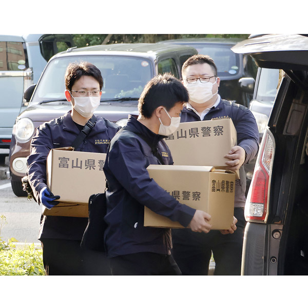 富山大の五福キャンパスを家宅捜索し、押収物を車両に積み込む富山県警の捜査員=12日午後、富山市(C)共同通信社