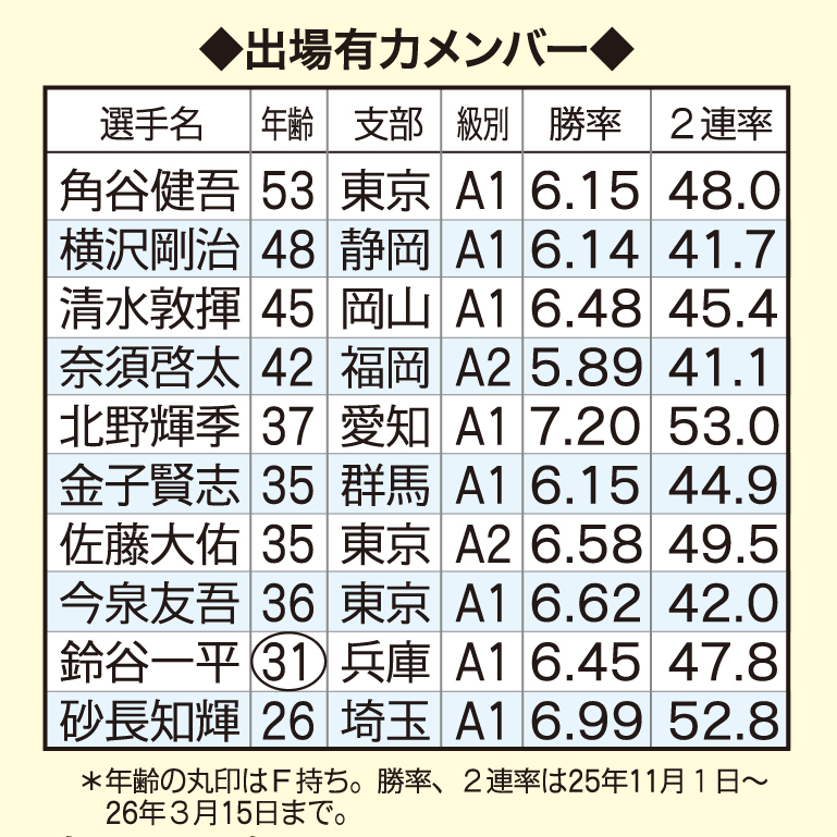 第25回日刊ゲンダイボートレースWEB杯 出場有力メンバー