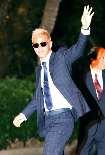 合宿地に到着しファンの歓声を受ける本田/(C)日刊ゲンダイ