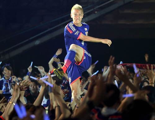 5月25日の日本代表壮行会で客席にボールを蹴り入れる本田/(C)日刊ゲンダイ