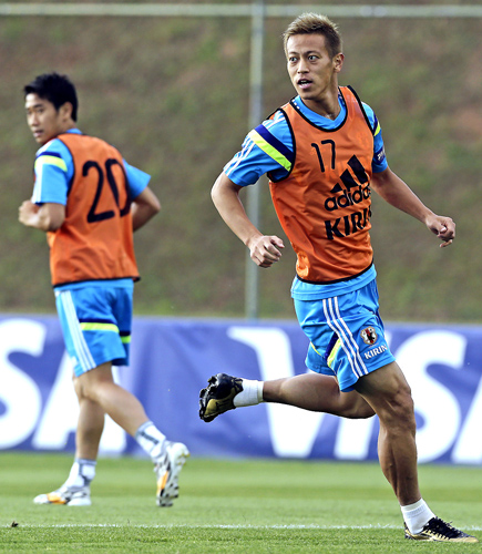 23日の練習でビブス組の本田と香川/(C)AP