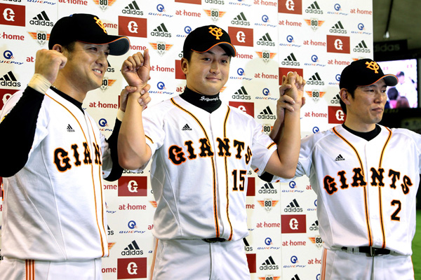 井端、高橋由と共にニッコリの沢村/(C)日刊ゲンダイ