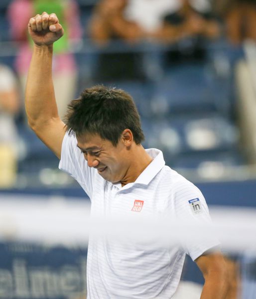ベスト4入りを決めガッツポーズの錦織/(C)AP