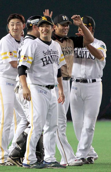 ソフトバンクナインに労われる稲葉/(C)日刊ゲンダイ