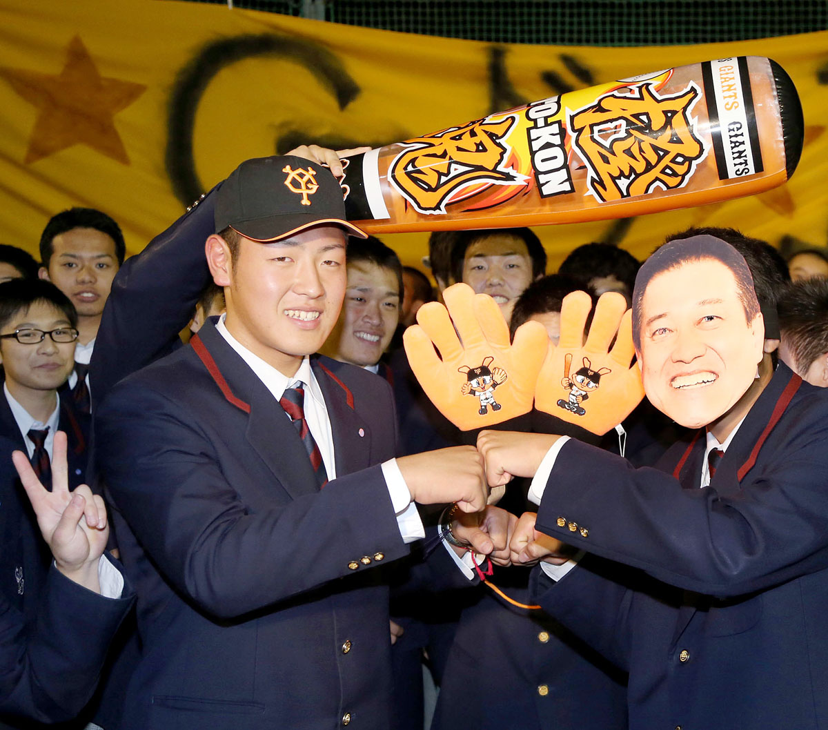 原監督のお面をつけた部員とグータッチを交わす岡本(左)/(C)日刊ゲンダイ