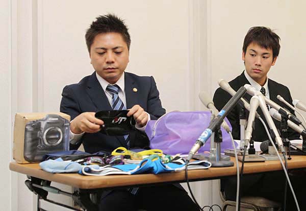 記者会見で当日のバッグの中身を確認する冨田(右)/(C)日刊ゲンダイ