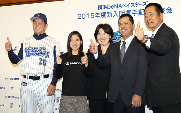 入団発表で家族、中畑監督と記念撮影/(C)日刊ゲンダイ