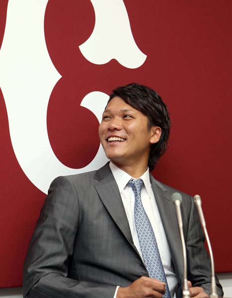 2億2000万円で更改し会見で笑顔を見せる坂本/(C)日刊ゲンダイ