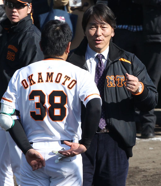 松井の激励に岡本は直立不動/(C)日刊ゲンダイ