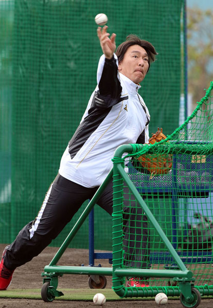 中畑監督相手に投手役を務めた松井/(C)日刊ゲンダイ