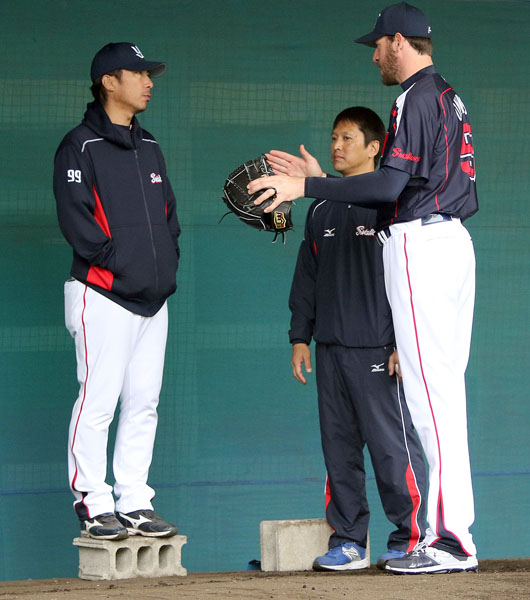 ブロックに乗ってオンドルセル(右)にアドバイスを送る高津コーチ/(C)日刊ゲンダイ