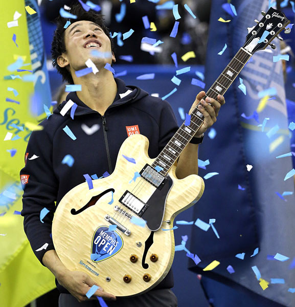 優勝トロフィーのギターを抱える錦織/(C)AP