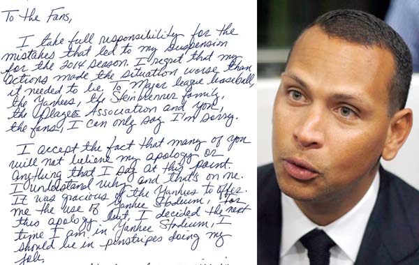 「責任取る」 薬物で出場停止のA・ロッドが手書き謝罪文公開