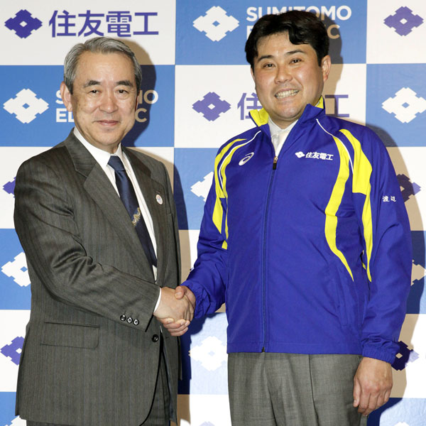 住友電工陸上部監督に就任する渡辺氏と松本社長(左)/(C)日刊ゲンダイ