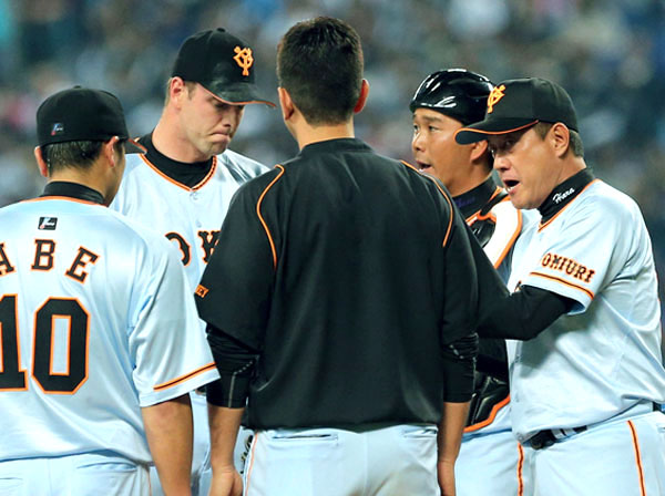 原監督(右)はゲキを飛ばすが…(左から2人目がマシソン)/(C)日刊ゲンダイ