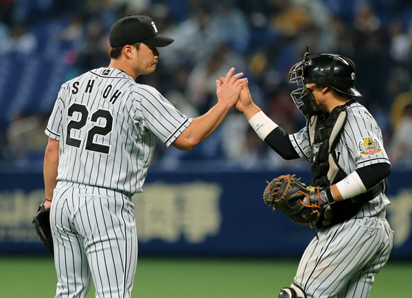 梅野とタッチを交わす呉昇桓(C)日刊ゲンダイ