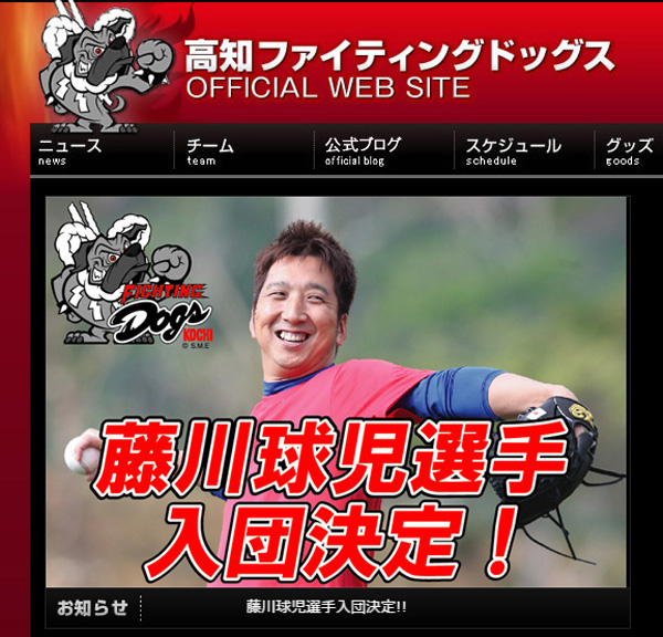 球団側も藤川球児入りを正式発表(高知ファイティングドッグスHPより)