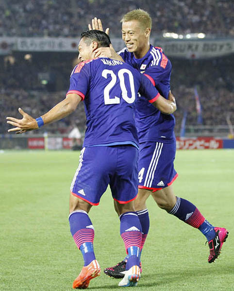 ともにゴールを決めた槙野(手前)と本田(C)日刊ゲンダイ