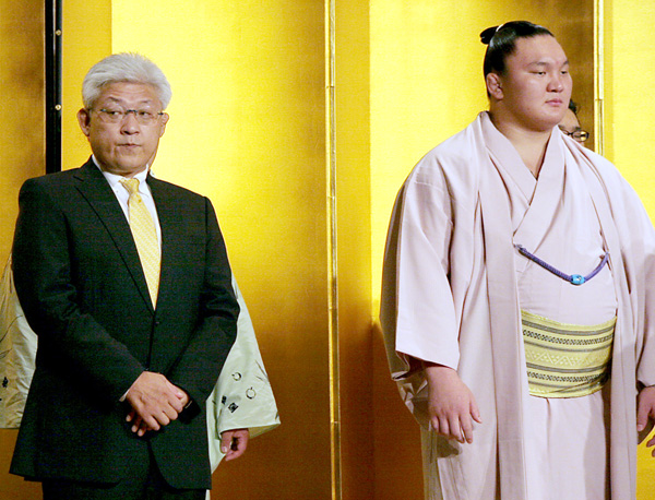 白鵬(右)と宮城野親方/(C)日刊ゲンダイ