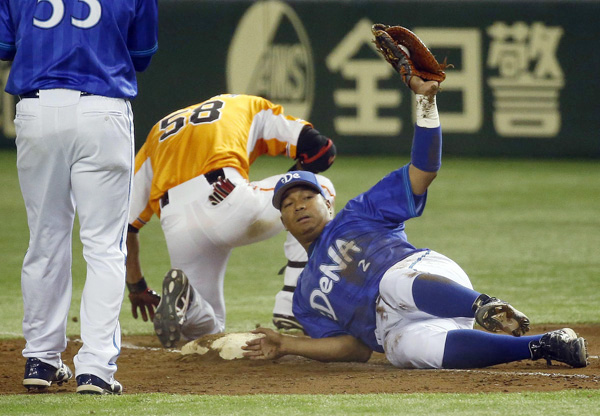 立岡はヘッドスライディングもアウトに(C)日刊ゲンダイ