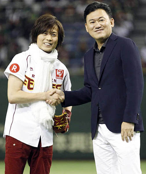 始球式を行ったつんく(左)と握手する三木谷オーナー(C)日刊ゲンダイ