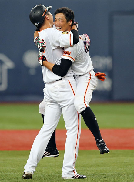 初サヨナラ打の鈴木尚(右)は坂本に抱きつく(C)日刊ゲンダイ