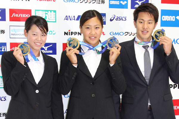 帰国した3人の金メダリストたち(C)日刊ゲンダイ