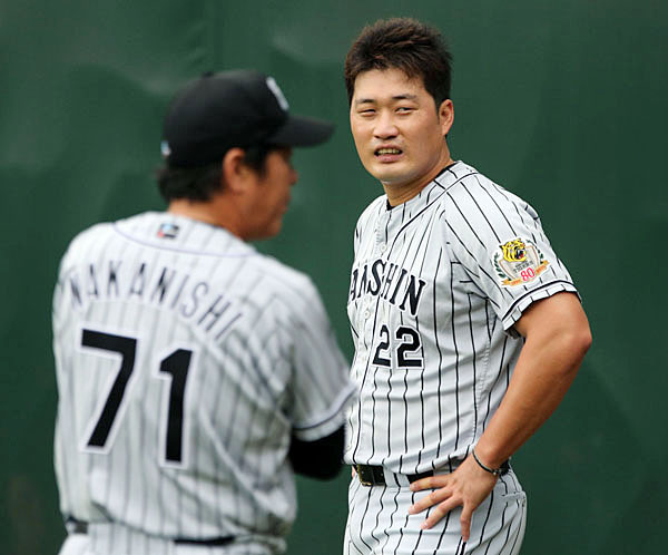台風で中止になり、練習で中西投手コーチと話す呉昇桓(C)日刊ゲンダイ