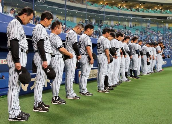 24日の試合前、中村GMを偲び黙祷する阪神ナイン(C)日刊ゲンダイ