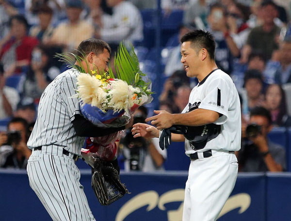 阪神の福留から花束を贈られる谷繁(C)日刊ゲンダイ