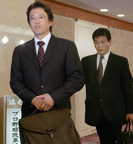 04年の球界再編成騒ぎのときは、古田選手会長(左)と力を合わせて戦った松原事務局長(C)日刊ゲンダイ
