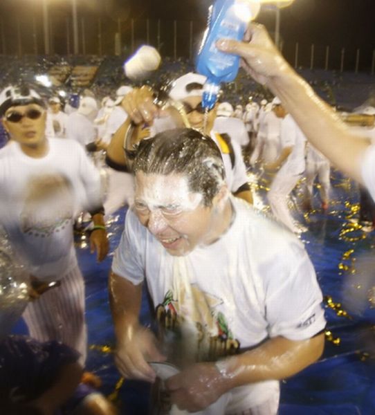祝勝会でビールを浴びる真中監督(C)日刊ゲンダイ