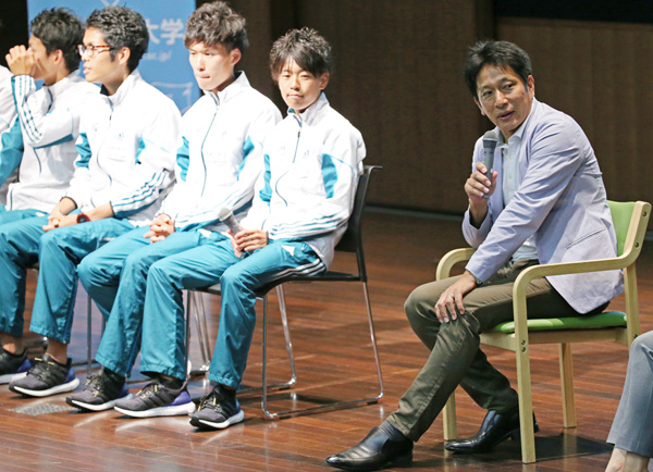 青山学院大学の公演で選手たちと(C)日刊ゲンダイ