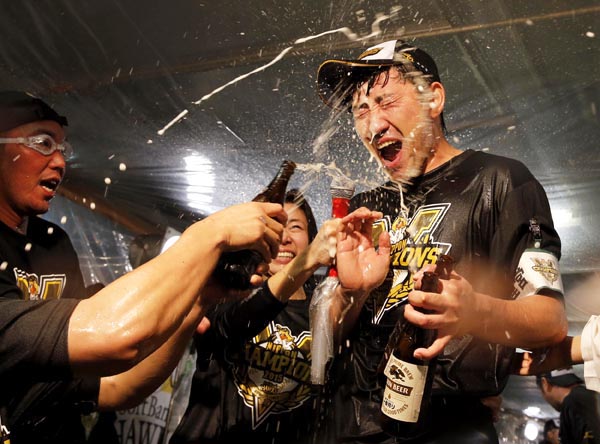 祝勝会でビールを浴びる内川(C)日刊ゲンダイ