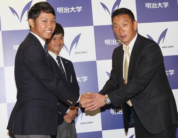 2位指名の坂本誠志郎捕手(奥)とともに金本監督と握手(C)日刊ゲンダイ