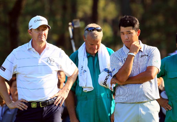 松山と一緒にラウンドしたJ・ウォーカー(左)/(C)日刊ゲンダイ